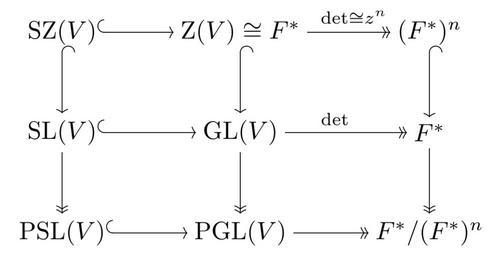 | Keywords: PSL-PGL.svg Commutative diagram showing the projective linear groups special and general and their relations Own work created as per en meta Help Displaying a formula Commutative diagrams; source code below 2009-05-07 Nils R Barth LaTeX source <source lang latex > \documentclass amsart \usepackageall ps dvips xy Loading the XY-Pic package Using postscript driver for smoother curves \usepackage color For invisible frame \begin document \thispagestyle empty No page numbers \SelectTips eu Euler arrowheads tips \setlength \fboxsep 0pt Frame box margin \color white \framebox \color black Frame for margin \xymatrix \mathrm SZ V \ar -> r \ar -> d \mathrm Z V \cong F \ar ->> r 6 \det \cong z n \ar -> d F n \ar -> d \\ \mathrm SL V \ar -> r \ar ->> d \mathrm GL V \ar ->> r \det \ar ->> d F \ar ->> d \\ \mathrm PSL V \ar -> r \mathrm PGL V \ar ->> r F / F n end math end frame \end document </source> Lie groups Commutative diagrams Xy-pic diagrams Images with LaTeX source code |