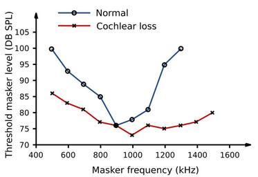 | Keywords: Psychoacoustical tuning curves.svg en To generate a psychoacoustical tuning curve choose any frequency and lower the amplitude such that the subject can barely detect it ~2dB above threshold This probe tone will be intermittent Then the masker tone is presented at a different frequency and increase the amplitude as high as possible such that the subject can still detect the probe tone Repeat the process for multiple frequencies and derive your line graph Here we see two psychoacoustical tuning curves - one for a normal cochlea and one for a cochlea with damaged outer hair cells Notice that the damaged cochlea is both less sensitive the line is lower and less selective the curve is not sharp Thus to restore hearing in someone with outer hair cell damage simple amplification is not enough since that raises inaudible indistinguishable sounds to the level of audible indistinguishable sounds The selectivity problem needs to be solved to have useful hearing Own Inductiveload 2009-02-15 SVG files on otology Sensory Neuroscience Hearing and speech |