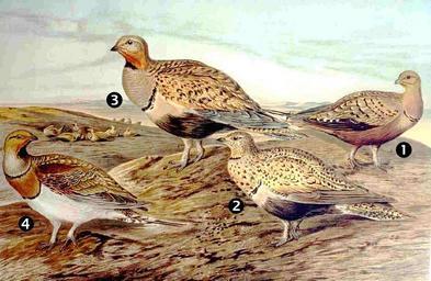 | Keywords: Pterocles sp marked.jpg 1 Pterocles exustus - Ganga à ventre brun - Chestnut-bellied - SandgrouseWüstenflughuhn<br/> 2 female Pterocles orientalis - Ganga unibande - Black-bellied Sandgrouse - Sandflughuhn<br/> 3 male Pterocles orientalis - Ganga unibande - Black-bellied Sandgrouse - Sandflughuhn<br/> 4 Pterocles alchata - Ganga cata - Pin-tailed Sandgrouse - Spießflughuhn Number-marked version of Image Pterocles sp jpg<br/> 1905 Johann Friedrich Naumann Naturgeschichte der Vögel Mitteleuropas Image Pterocles sp jpg original scan from the book File Pterocles orientalis Naumann jpg extracted image NAUMANN PD-old Pterocles exustus Pterocles orientalis Pterocles alchata |