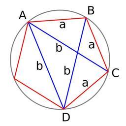 | Keywords: Ptolemy Pentagon.svg Ptolemy's theorem to the quadrilateral made by removing a vertex from a regular pentagon yields b/a phi the golden ratio This drawing illustrates it Own by en User Dicklyon Uploaded by en User Dicklyon to en wikipedia in August 2006 http //en wikipedia org/w/index php title Special Log page File Ptolemy_Pentagon svg log en User Dicklyon Dicklyon Regular pentagons |