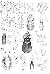 | Keywords: PTRS168 0631.png 9 Canonopsis sericeus <small>C Waterh </small> Canonopsis sericeus <small>C O Waterhouse 1875</small> 9 dorsal view 9<sup>a</sup> antenna <br/> 10 Ectemnorhinus viridis <small>G Waterh </small> Ectemnorhinus viridis <small>G R Waterhouse 1853</small> 10 dorsal view 10<sup>a</sup> antenna <br/> 11 Ectemnorhinus angusticollis <small> C Waterh </small> Bothrometopus angusticollis <small> C O Waterhouse 1875 </small> 12 dorsal view 12<sup>a</sup> antenna <br/> 12 Ectemnorhinus gracilipes <small> C Waterh </small> Bothrometopus gracilipes <small> C O Waterhouse 1875 </small> 13 dorsal view 13<sup>a</sup> antenna <br/> 13 Ectemnorhinus brevis <small> C Waterh </small> Bothrometopus brevis <small> C O Waterhouse 1875 </small><br/> 14 Ectemnorhinus eatoni <small>C Waterh </small> Palirhoeus eatoni <small> C O Waterhouse 1875 </small> 14 dorsal view 14<sup>a</sup> antenna <br/> 15 Phytosus atriceps <small>C Waterh </small> Leptusa atriceps <small> C O Waterhouse 1875 </small><br/> 16 Docophorus dentatus <small>Giebel</small> Docophoroides brevis <small> Dufour 1835 </small> 16 dorsal views of male and female 16<sup>a</sup> antenna of female 16-1 left foreleg of female 16-2 left middle leg of female 16-3 left hindleg <br/> 17 Nirmus angulicollis <small>Giebel</small> Episbates pederiformis <small> Dufour 1835 </small> 17 dorsal view 17-1 right foreleg 17-2 right middle leg 17-3 right hindleg <br/> 18 Nirmus setosus <small>Giebel</small> Pelmatocerandra setosa <small> Giebel 1876 </small> 18 dorsal view 18<sup>a</sup> antenna 18-1 right foreleg 18-3 right hindleg <br/> 19 Goniodes brevipes <small>Giebel</small> Austrogoniodes brevipes <small> Giebel 1876 </small> 19 dorsal view and right foreleg of female 19<sup>a</sup> antenna of female <br/> 20 Lipeurus clypeatus <small>Giebel</small> Guenterion clypeatus <small> Giebel 1874 </small> 20 dorsal view 20<sup>a</sup> antenna 20-1 right foreleg 20-2 right middle leg 20-3 right hindleg <br/> Philosophical Transactions of the Royal Society 168 An Account of the Petrological Botanical and Zoological Collections Made in Kerguelen's Land and Rodriguez During the Transit of Venus Expedition Carried Out by Order of Her Majesty's Government in the Years 1871-1875 Plate XIV 1879 Scan by the Internet Archive PD-old Philosophical Transactions - Volume 168 Coleoptera illustrations Drawings of insects Insecta anatomy Canonopsis sericeus Ectemnorhinus viridis Bothrometopus angusticollis Bothrometopus gracilipes Bothrometopus brevis Palirhoeus eatoni Leptusa atriceps Docophoroides brevis Episbates pederiformis Pelmatocerandra setosa Austrogoniodes brevipes Guenterion clypeatus Curculionidae anatomy |