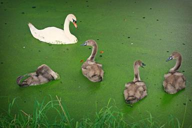 Keywords: swan cygnet bird waterbird chick young family swimming pool duckweed public domain dedication publicdomaindedication pixabay mabelamber