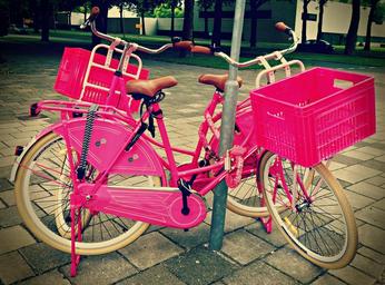 Keywords: bicycle bike vehicle transport cargo bike cargobike cycling exercise ride parked bike parkedbike pink pink bike pinkbike public domain dedication publicdomaindedication pixabay pexels mabelamber