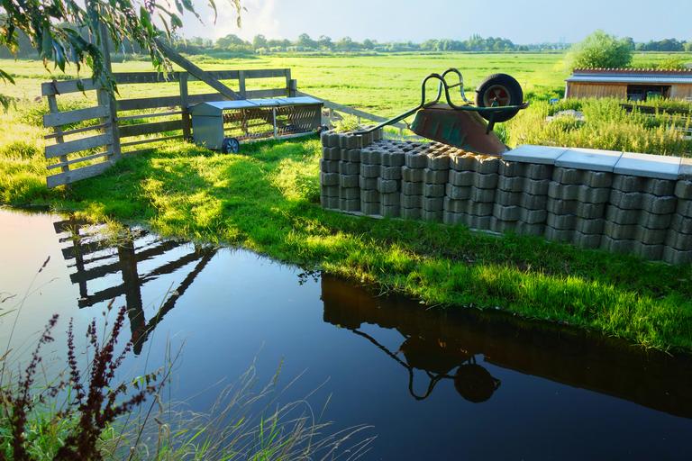 Keywords: holland landscape dutch landscape dutchlandscape wheelbarrow watercourse meadow fence rural farmland country green netherlands summer public domain dedication publicdomaindedication pixabay pexels mabelamber