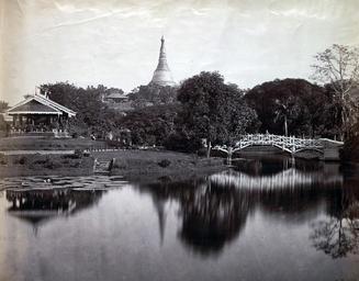 | Keywords: Public Gardens, Rangoon.jpg en Photograph of the Cantonment Gardens in Rangoon Yangon Burma Myanmar taken by J Jackson in about 1868 part of the Dunlop Smith Collection Sir Charles Aitchison Album of Views in India and Burma The Cantonment Gardens were situated immediately to the south-west of the Shwe Dagon Pagoda within the military cantonment They were planned in 1854-56 by William Scott of the Calcutta Botanic Gardens and laid out by the city's Public Works Department This was a popular view of the gardens With a summerhouse to the left and a rustic wooden bridge to the right it is centred on the spire of the Shwe Dagon on the skyline and its reflection in the lake A gilded bell-shaped stupa the pagoda can be glimpsed from all over Rangoon due to its elevated position on Singuttara Hill http //www bl uk/onlinegallery/onlineex/apac/photocoll/p/019pho0000355s1u00167000 html Jackson J 1868 Public domain PD-old Yangon Shwedagon pagoda Rangoon in the 19th century Reflections in lakes Water reflections of structures Country known JotaCartas Water reflections |