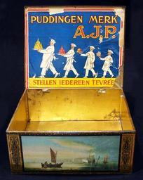 | Keywords: Puddingen Merk AJP blik, foto 1.JPG Very old packaging of a Dutch product that is not produced and/or not sold any more Photographed at a collector of Droste memorabilia and old tin cans For more info see http //www tincollectors nl/ tincollectors nl or email info tincollectors nl own 2014-04-11 11 14 25 Alf van Beem CC-Zero Trademarked Food tins Willem van de Velde II | ||||