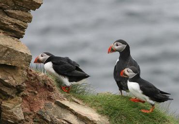 Keywords: puffin birds group coast cliff wait bill orange funny