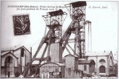 | Keywords: Puits Arthur de Buyer.jpg fr Le gisement de Ronchamp-Champagney a été exploité depuis la seconde moitié du XIXe siècle dans 27 puits Ces installations industrielles sont les puits Arthur de Buyer à une époque le plus profond de France -1010m Numérisation d'un carte postale des années 10-20 Scan d'un carte postale des année 10-20 Author 20's maxi PD-Old Aucune Puits Arthur de Buyer documents d'époque Postcards of Haute-Saône Historical images of Haute-Saône | ||||