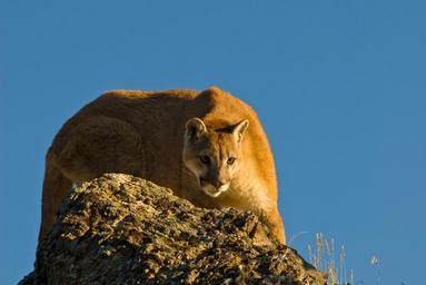 Keywords: puma mountain lion crouching cougar cat carnivore predator mammal dangerous crouch early morning light stalking wildlife rock feline power staring