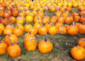 Keywords: pumpkins autumn fall orange yellow fruits green background green grass backgrounds decorative harvesting seasonal seasons healthy edible foods nutritious october thanksgiving arranged arrangement ground