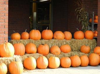 Keywords: pumpkins squashes fruits orange autumn fall seasonal harvest healthy nutritious foods sweet tasty colorful arranged arrangement thanksgiving holidays outdoors buildings