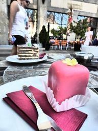 Keywords: punschkrapferl pastry shop dessert sweetness coffee and cake fork table cutlery street scene
