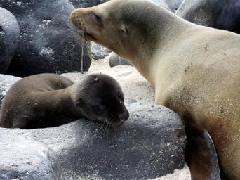 Keywords: pup mother sea lion baby bond galapagos islands beach ecuador