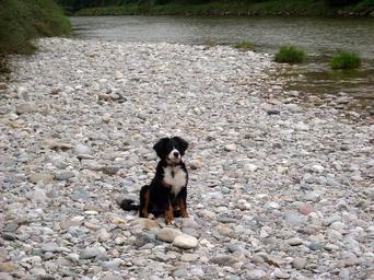 Keywords: puppy bitch berner sennen dog friend face portrait go walkies curious pet water swim