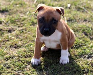 | Keywords: puppy dog staffordshire bullterrier pet animal cute canine adorable breed purebred domestic mammal friend small portrait doggy pedigree little young funny brown pup sitting happy terrier looking alert fur obedient ears staffy companion domesticated friendly |