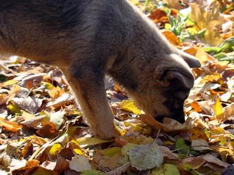 Keywords: puppy leaves autumn yellow sniffing looking for sun shadow