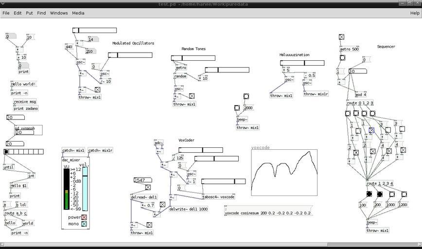Keywords: PureData-Harvie-Examples.png en Example patch created in Pure Data You can see some sound synthetizers voxcoder and simple sequencer connected to simple volume control and vu-meter cs Ukázkový patch vytvořený v jazyce Pure Data Můžete vidět několik zvukových syntetizérů voxkodér a jednoduchý sequencer to vše připojené k ovladači hlasitosti a vu-metru uk П иклад петчу у PureData істить синтезато и звуку вокоде а також п остий секвенце під єднаний до п остого егулято а гучності і VU-мет а Own Harvie 5 1 2009 Pure Data Programming Audio signal processors Audio signal processing |