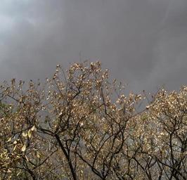 Keywords: purple sky cloudy trees dry leaves reflecting brightly cold winter tops of sycamore trees