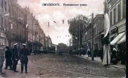 Keywords: Puskinskaya Street 1.jpg en Pushkin Street now - Lenin Street in Smolensk ru Пушкинская улица ныне - улица Ленина в Смоленске О игинальная отк ытка е установлены before 1917 года PD-RusEmpire 20th-century postcards Postcards of Smolensk
