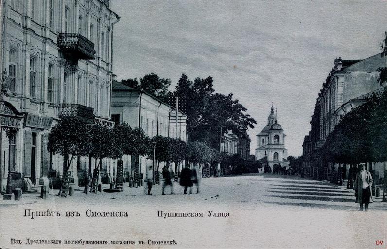 | Keywords: Puskinskaya Street 4.jpg en Pushkin Street now - Lenin Street in Smolensk In the background - Odigitrievsky Church no longer exists ru Пушкинская улица ныне - улица Ленина в Смоленске а заднем плане - Одигит иевская це ковь ныне не существует О игинальная отк ытка Изд Д езденского писчебумажного магазина в Смоленске before 1917 года PD-RusEmpire 20th-century postcards Postcards of Smolensk | ||||
