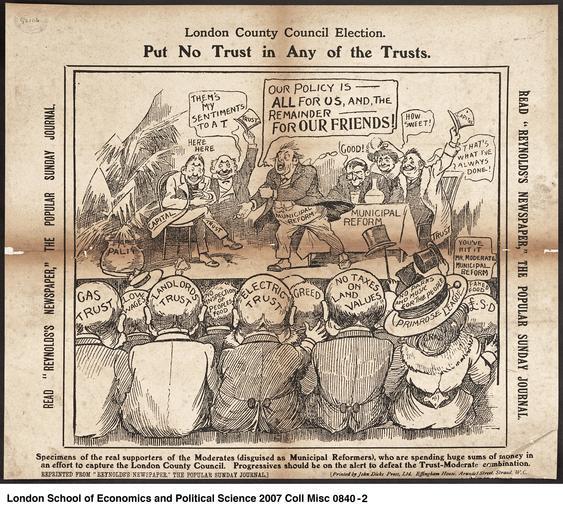 | Keywords: political posters politicalposters london politics council ancient text architecture drawing photo border sketch Coll Misc 0840-2 The cartoon in this poster shows a political meeting and a speaker shouting to an audience. The Speaker has 'Municipal Reform' written on his belly and is saying (in speech bubble) 'Our Policy is- All for us, and, the remainder-for our friends!'. He is flanked by two men to his right, who are marked 'Capital Trust'. To his left, seated behind a table marked 'Municipal Reform', are three figures, one of whom declares, 'That's what I've always done!'. At the bottom of the cartoon are the heads of the audience from the back. On these heads are written various terms, such as 'Gas Trust','Landlords Trust' and 'No Parks and Music for the People, Primrose League'. Coll Misc 0840-2 The cartoon in this poster shows a political meeting and a speaker shouting to an audience. The Speaker has 'Municipal Reform' written on his belly and is saying (in speech bubble) 'Our Policy is- All for us, and, the remainder-for our friends!'. He is flanked by two men to his right, who are marked 'Capital Trust'. To his left, seated behind a table marked 'Municipal Reform', are three figures, one of whom declares, 'That's what I've always done!'. At the bottom of the cartoon are the heads of the audience from the back. On these heads are written various terms, such as 'Gas Trust','Landlords Trust' and 'No Parks and Music for the People, Primrose League'. |