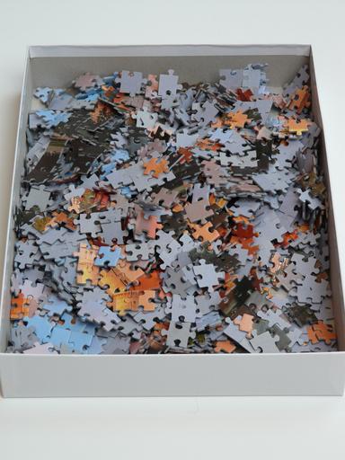 Keywords: puzzle unfinished cardboard box mess unresolved chaos pieces of the puzzle memory cards covered with play patience boredom pastime share piecing together