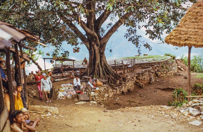 | Keywords: batti chautara commerce community tea shop teashop nepal outdoor tree plant Date: 1968 Location: Dhankuta, Dhankuta Description: Gumounni Chautara (round resting spot). The trail from Dharan to Dhankuta crossed the first ridge of hills and descended to the Tamur river and crossed at Mulghat. Half way up the hill from Mulghat to Dhankuta Bazaar is a chautara with two large pipel (ficus) trees. Chautaras form welcome resting spots and the trees provide welcome shade. Date: 1968 Location: Dhankuta, Dhankuta Description: Gumounni Chautara (round resting spot). The trail from Dharan to Dhankuta crossed the first ridge of hills and descended to the Tamur river and crossed at Mulghat. Half way up the hill from Mulghat to Dhankuta Bazaar is a chautara with two large pipel (ficus) trees. Chautaras form welcome resting spots and the trees provide welcome shade. |