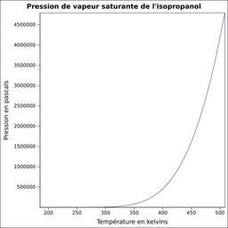 | Keywords: Pvs isopropanol.svg fr Pression de vapeur saturante calculée d'après <br/> Robert H Perry et Donald W Green Perry's Chemical Engineers' Handbook McGraw-Hill USA 1997 7e éd 2400 p ISBN 0-07-049841-5 p 2-50 own Epop 2010-06-24 Created with Gnumeric Vapor-Liquid equilibrium curves |