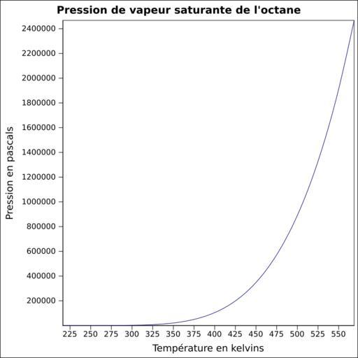 | Keywords: Pvs octane.svg fr Pression de vapeur saturante calculée d'après <br/> Robert H Perry et Donald W Green Perry's Chemical Engineers' Handbook McGraw-Hill USA 1997 7e éd 2400 p ISBN 0-07-049841-5 p 2-50 own Epop 2010-06-24 Created with Gnumeric Vapor-Liquid equilibrium curves |