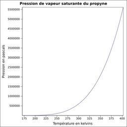 | Keywords: Pvs propyne.svg fr Pression de vapeur saturante calculée d'après <br/> Robert H Perry et Donald W Green Perry's Chemical Engineers' Handbook McGraw-Hill USA 1997 7e éd 2400 p ISBN 0-07-049841-5 p 2-50 own Epop 2010-06-24 Created with Gnumeric Vapor-Liquid equilibrium curves |