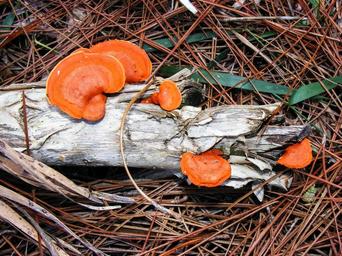 Keywords: pycnoporus cinnabarinus cinnabar polypore orange shelf fungus outside nature plant pine leaves branch dead brown creepy tree dry
