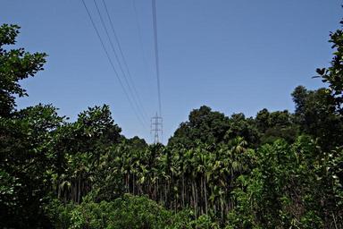 Keywords: pylon electric power power lines high voltage thick forest mountain arecanut plantation karnataka india