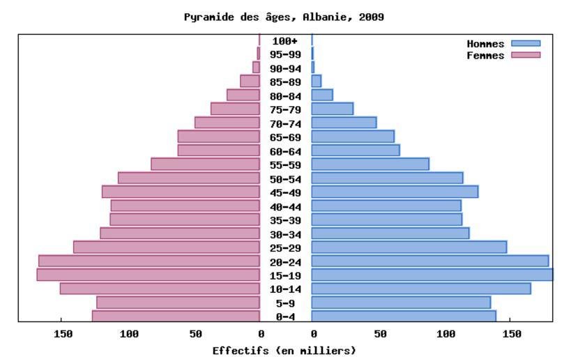 | Keywords: Pyramide Albanie.PNG fr Pyramide des âges Albanie 2009 en Population pyramid of Albania 2009 Own work by uploader Gnuplot Demmo 2010-05-30 diagram Population pyramids of Albania Images with Gnuplot source code Sources U S Census bureau International database http //www census gov/ipc/www/idb/country php Gnuplot Version 4 2 patchlevel 2 Gnuplot source <source lang gnuplot > POPULATION PYRAMID Script last modified 30-May-2010 scale 1000 ADJUST AS NECESSARY The increment would better be automatic but set xtics doesn't allow to specify start only increment 50 ADJUST THIS AS NECESSARY gap_width 0 11 ADJUST THIS AS NECESSARY ADJUST TITLES AS NECESSARY set encoding iso_8859_1 set title Pyramide des \342ges Albanie 2009 set xlabel Effectifs en milliers Input file contains comma-separated values fields set datafile separator Plot to dummy device and retrieve the male/female population range set term unknown set autoscale xfix plot data csv using 4/scale 2 data csv using - 5/scale 2 range_male GPVAL_X_MAX > -GPVAL_X_MIN GPVAL_X_MAX -GPVAL_X_MIN range_female range_male central_gap range_male + range_female gap_width set term png transparent truecolor size 640 400 set term svg size 800 500 dynamic font sans-serif set style data boxxyerrorbars set style fill solid 0 5 border Y axis is invisible unset ytics set autoscale yfix X axis is labeled from zero onwards with the given increment set xrange -range_female-central_gap range_male set xtics nomirror 0 increment set x2range range_female -central_gap-range_male set x2tics axis 0 increment plot \ data csv using 0 2 0 4/scale 2 2+4 \ title Hommes linetype rgb 296dcc \ data csv using 0 2 0 5/scale 2 2+4 axes x2y1\ title Femmes linetype rgb aa3f74 \ data csv using -central_gap/2 2+1 8 2 title with labels </source> CSV pyramid data file as retrieved from US Census Bureau International Database without modifications Data file data csv <pre> Midyear Population by Age and Sex for Albania Year Age Both Sexes Population Male Population Female Population 2009 Total 3639453 1857086 1782367 2009 0-4 266139 139372 126767 2009 5-9 258765 135432 123333 2009 10-14 316440 165724 150716 2009 15-19 351050 182681 168369 2009 20-24 346638 179322 167316 2009 25-29 288262 147540 140722 2009 30-34 239615 119073 120542 2009 35-39 226496 113288 113208 2009 40-44 225152 113158 111994 2009 45-49 245353 126128 119225 2009 50-54 221223 114592 106631 2009 55-59 170479 88796 81683 2009 60-64 127574 66423 61151 2009 65-69 123948 62412 61536 2009 70-74 96663 48345 48318 2009 75-79 67126 30957 36169 2009 80-84 39573 15337 24236 2009 85-89 20969 6764 14205 2009 90-94 6194 1493 4701 2009 95-99 1576 230 1346 2009 100+ 218 19 199 </pre> |