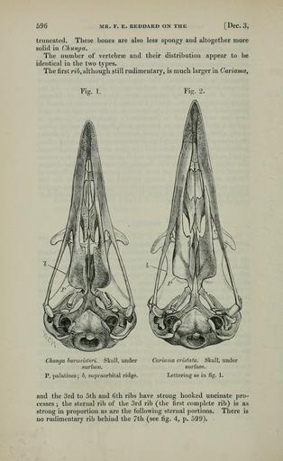 | Keywords: PZSL1889Page596.png left Chunga burmeisteri Chunga burmeisteri <small> Hartlaub 1860 </small> right Cariama cristata Cariama cristata <small> Linnaeus 1766 </small> en Black-legged Seriema left and Red-legged Seriema right skulls without lower jaw from ventral b supraorbital ridge P palatine bone Proceedings of the Zoological Society of London http //archive org/details/proceedingsofgen89zool vol 1889 issue 4 http //archive org/stream/proceedingsofgen89zool page/596/mode/1up page 596 1889 published 1890 F E Beddard text PD-old-70-1923 PZSL 1889-4 Cariamidae bones Chunga burmeisteri Cariama cristata illustrations Bird skull comparisons |