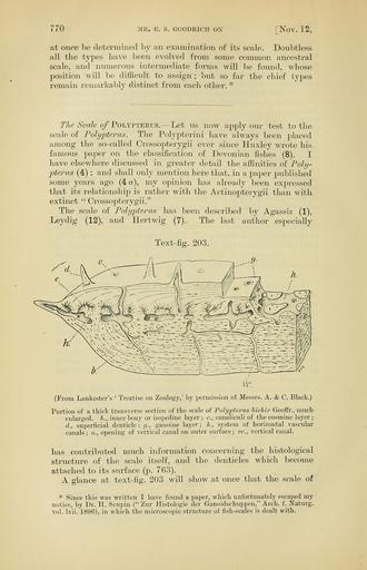 | Keywords: PZSL1907Page0770.png Polypterus bichir <small>Geoffr sic</small> Polypterus bichir bichir <small>Lacépède 1803</small> en Diagrammatic view of a Nile Bichir scale b isopedine inner bony layer c canaliculi of the cosmine layer d superficial denticles g ganoine layer h horizontal vascular canals o openings of vertical canals vc vertical canals Proceedings of the Zoological Society of London http //archive org/details/proceedingsofzoo19074471121zool vol 1907 issue 4 http //archive org/stream/proceedingsofzoo19074471121zool page/770/mode/1up page 770 1907 published 1908 From Lankester's Treatise on Zoology by permission of Messrs A C Black PD-old PZSL 1907-4 Illustrations of fish scales Polypterus bichir |