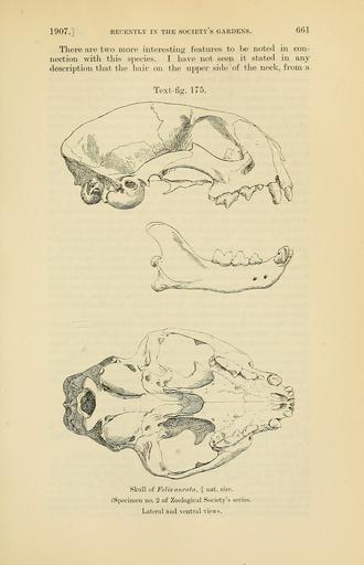 | Keywords: PZSL1907Page661.png Felis aurata <small>Temminck</small> Accra Profelis aurata celidogaster <small> Temminck 1827 </small> en African Golden Cat skull from lateral above and skull without lower jaw from ventral below Proceedings of the Zoological Society of London http //archive org/details/proceedingsofzoo19074471121zool vol 1907 issue 3 http //archive org/stream/proceedingsofzoo19074471121zool page/661/mode/1up page 661 1907 R I Pocock text PD-old PZSL 1907-3 Profelis aurata skulls | ||||