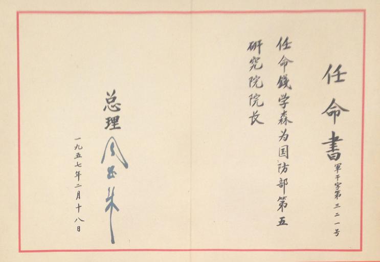 Keywords: Qian Xuesen - Appointment 1957.JPG zh-cn 周恩 签署的任命钱学森为国防部第五研究院院长的任命书,图为上海交 大学钱学森图书馆藏任命书原件 en Appointment signed by Zhou Enlai in which Qian Xuesen was appointed as president of the 5th Research Institute of the Ministry of National Defense of China The original copy is owned by Qian Xuesen Library of Shanghai Jiao Tong University where the photo was taken 1957-02-18 photo taken on 2015-09-25 16 13 35 zh-cn 上海交 大学钱学森图书馆藏文物 en Original copy owned by Qian Xuesen Library of Shanghai Jiao Tong University zh-cn 中华人民共和国国务院 other versions 31 202930555556 121 43081666667 heading 174 23714285714286 PD-PRC-exempt Qian Xuesen Zhou Enlai in 1957 Qian Xuesen Library Shanghai |