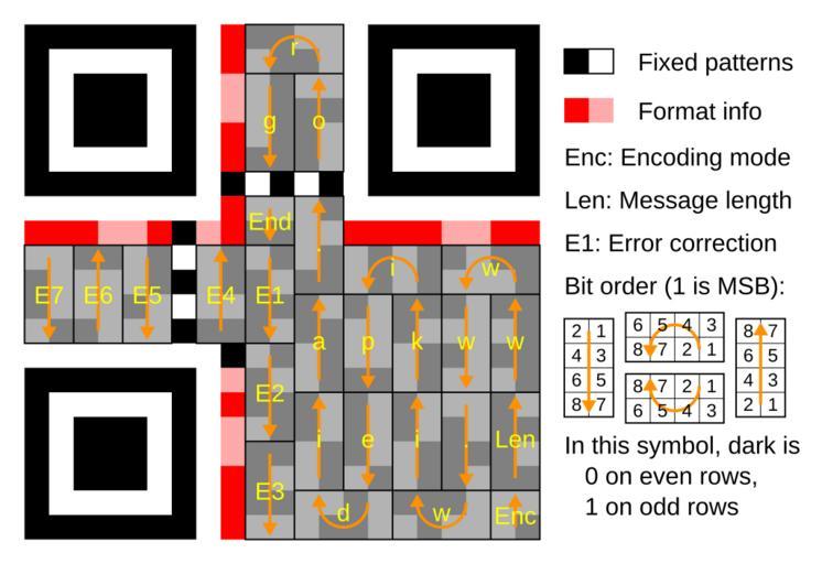 | Keywords: QR Character Placement.svg This diagram illustrates the placement of the message characters within a QR code Starting from the lower-right corner the first four bits define the encoding used in this case 8 bits per character Next is the length of the message 17; dark stands for 1 but the masking process used in this symbol inverts alternate rows Following that is the message itself then the end-of-message marker and finally the error-correcting codes en Shows the placement of message characters within a QR code 2011-10-14 own Bobmath cc-zero Uploaded with UploadWizard QR Code Diagrams |