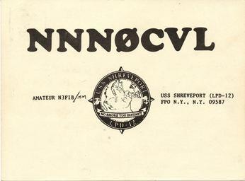| Keywords: QSL-NN0CVL-1987.jpg en QSL card of Navy MARS station NNN0CVL aboard USS Shreveport LPD-12 confirming an amateur radio QSO using callsign N3FIB/MM with station G0HPB on 14266 kHz Own collection US Navy MARS < 1987 PD-USGov-Military-Navy Military Auxiliary Radio System QSL cards |