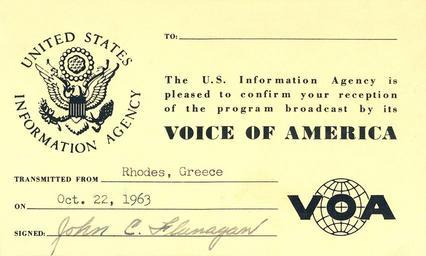 | Keywords: QSL VOA Rhodes-1963.jpg en QSL card confirming a reception report for a Voice of America broadcast aired via Rhodes Greece https //www flickr com/photos/alcue/453558387 Voice of America signed by John C Flanagan 1963-10-22 PD-USGov-VOA QSL cards Voice of America |