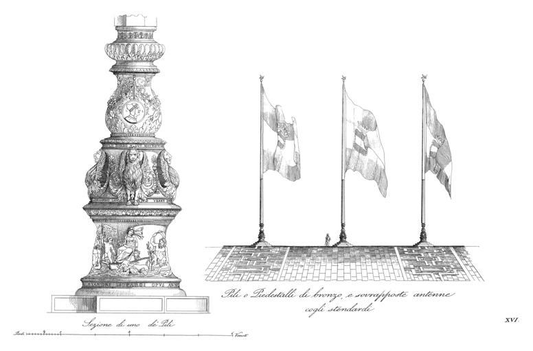 MAKE A MEME View Large Image Piazza San Marco (1831), 16.jpg 15 XVI 01 Pili o Piedestalli di bronzo e souvrapposte antenne cogli stendardi LangSwitch The three delicate bronze flagpoles or pylones at the east end of the Piazza San Marco facing the main façade of St ...