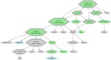 | Keywords: Quake - family tree 2 Simplified.svg id Tech family of video game engines by Id Software id Tech 1 debut in Quake in June 1996 Id Tech 2 debut in Quake II in December 1997 id Tech 3 debut in Quake III Arena December 1999 id Tech 4 debut in Doom 3 in August 2004 <br> Note id Tech 5 debut in Rage in October 2011 and id Tech 6 TBA are not available under the GNU General Public License GPL <br>Note Quake Wars Ray Traced and Wolfenstein Ray Traced are a different engines <br> Legend <span style color 85dc85 > –ˆ –ˆ</span> free/libre <span style color b1dae7 > –ˆ –ˆ</span> freeware <span style color cfcfcf > –ˆ –ˆ</span> commercial <span style color cfcfcf;background-color 85dc85 > –Œ –Œ</span> available with commercial license or free/libre license ellispe shape for games hexagon shape for engines using the command <code>fdp</code> from the http //www graphviz org/ Graphviz package Feel free to patch this code or to talk about it in his talk page <pre> // dot -oengine svg -Tsvg engine dot digraph ratio auto; sep +4 5 ; // // Engines // node shape polygon sides 6 style filled // id Tech engines node peripheries 4 size 6 // id Tech engines under GPL node fillcolor lightgreen idTech1-0 label id Tech 1-0\nQuake engine fontsize 20 GLQuake WinQuake QuakeWorld idTech2 label id Tech 2\nQuake II engine fontsize 20 idTech3 label id Tech 3\nQuake III engine fontsize 20 idTech4 label id Tech 4\nDoom 3 engine fontsize 20 // id Tech under commercial license node fillcolor lightgrey idTech5 label id Tech 5 fontsize 20 // Other engines // node peripheries 1 // Other commercial engines node fillcolor lightgrey GoldSrc SourceEngine label Source Engine // Other libre/open engines node fillcolor lightgreen DarkPlaces HexenIIengine label Hexen II Engine ioquake3 ioUrbanTerror // // Games // node shape ellipse color transparent // Commercial Games node fillcolor lightgrey Doom3 label Doom 3 Heretic2 label Heretic 2 HexenII label Hexen II Quake QuakeII label Quake II QuakeIIIArena label Quake III Arena Quake4 label Quake 4 Rage // GoldSrc Source HalfLife label Half-Life Halflife2 label Half-Life ² // Freeware games node fillcolor lightblue QuakeLive label Quake Live UrbanTerror label Urban Terror // Libre/open games node fillcolor lightgreen Nexuiz // // Trees // // Games idTech2-0 -> Quake DarkPlaces -> Nexuiz HexenIIengine -> HexenII GoldSrc -> HalfLife SourceEngine -> Halflife2 idTech2 -> Heretic2; QuakeII; idTech3 -> QuakeIIIArena; QuakeLive; ioquake3 -> Tremulous ioUrbanTerror -> UrbanTerror idTech4 -> Doom3; Quake4; idTech5 -> Rage // Main engines idTech2-0 -> idTech2 -> idTech3 -> idTech4 -> idTech5 // Derivated engines idTech2-0 -> GLQuake -> idTech2 idTech2-0 -> QuakeWorld -> GoldSrc idTech2-0 -> WinQuake -> HexenIIengine GLQuake -> QuakeWorld; DarkPlaces; GoldSrc -> SourceEngine idTech2 -> GoldSrc idTech3 -> ioquake3 ioquake3 -> ioUrbanTerror </pre> Quake Video game family trees |