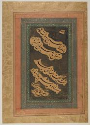 | Keywords: Quatrain Eulogizing a King WDL6990.png Artwork ru Аль-Табиб Рукн аль-Дин асуд fr al-Tabib Rukn al-Din Mas'ud en al-Tabib Rukn al-Din Mas'ud zh 鲁 ·丁·麦斯伍德·塔比伯 pt al-Tabib Rukn al-Din Mas'ud ar الطبيب، رُكن الدين مسعود es al-Tabib Rukn al-Din Mas'ud ru Четве остишие восхваляющее п авителя fr Quatrain faisant l'éloge d'un roi en Quatrain Eulogizing a King zh 颂扬 位国王的四行诗 pt Quadra laudativa a um rei ar رُبَاعِيَّة في مدح مَلِك ru В этом каллиг афическом ф агменте соде жится <em> убаи</em> четве остишие выполненное пятистопным ямбом в честь п авителя Стихи написаны по диагонали че ными че нилами письмом насталик окаймлены полосами из облаков и наклеены на г убо ок ашенную основу лилового цвета Они гласят О П авитель Да будут ут а твоей судьбы/Длиться до ут а дня Сбо а/Пусть удача доведет тебя до к айних п еделов надежды/И да минует тебя завистливое око В таких вы ажениях поэт желает п авителю удачи до скончания в емен буквально вплоть до <em>mahshar</em> дня Сбо а на Ст ашный Суд и вечной защиты от зависти или <em>chasm-i bad</em> завистливого ока В нижнем левом углу каллиг аф Рукн аль-Дин асуд аль-Табиб сообщает что пе еписал <em>namaqahu</em> текст и п осит Бога п остить его за несове шенства Рукн аль-Дин имел п озвище аль-Табиб докто поскольку он п оисходил из д евнего ода в ачей п авителей и сам занимал высокий пост п и диване или дво е шаха Аббаса I годы п авления 1587 1629 гг в Исфахане Когда пе сидский п авитель не вылечился от болезни он заставил Рукн аль-Дина ве нуть жалованье и вынудил его покинуть го од Рукн аль-Дин отп авился в ашхад севе о-восточный И ан а оттуда в Балх сов еменный Афганистан и далее в Индию Он п иоб ел известность как масте стиля письма насталик Возможно Рукн аль-Дин создал это хвалебное четве остишие для шаха Аббаса I до своего изгнания <br>Каллиг афия пе сидская; Иллюмини ование укописей; Исламские укописи; Ко оли и п авители; Письмо насталик; Пе сидская поэзия; Поэзия fr Ce fragment de calligraphie est composé d'un <em>ruba'i</em> quatrain en pentamètre iambique honorant un roi Écrits en oblique avec des caractères nasta'liq noirs les vers apparaissent dans des rubans de nuage sur un fond violet peint assez sommairement et indiquent « Oh roi puissent les matins de ta fortune / Durer jusqu'au matin du jour du rassemblement / Puissent la chance te mener aux limites extrêmes de l'espoir / Et le mauvais œil ne jamais t'atteindre » Avec ces paroles le poète souhaite au roi la bonne fortune jusqu'à la fin des temps littéralement jusqu'au <em>mahshar</em> jour du rassemblement lors du Jugement dernier et la protection éternelle contre l'envie ou <em>chasm-i bad</em> mauvais œil Dans l'angle inférieur gauche une note du calligraphe Rukn al-Din Mas'ud al-Tabib mentionne qu'il a copié le <em>namaqahu</em> texte et il demande à Dieu de pardonner ses défauts Rukn al-Din fut surnommé al-Tabib le docteur car il était issu d'une longue lignée de médecins du roi Il occupa d'ailleurs un haut poste à la cour ou divan du Chah 'Abbas I<sup>er</sup> règne 1587 1629 à Isfahan mais lorsque le souverain persan ne se remit pas d'une maladie il demanda que Rukn al-Din le remboursât puis il le chassa de la ville Rukn al-Din partit pour Mashhad dans le nord-est de l'Iran ville à partir de laquelle il voyagea jusqu'à Balkh aujourd'hui en Afghanistan et finalement en Inde Maître reconnu de l'écriture nasta'liq il a probablement réalisé ce quatrain élogieux pour le Chah 'Abbas I<sup>er</sup> avant que ce dernier le bannisse <br>Calligraphie persane; Enluminures; Manuscrits islamiques; Rois et dirigeants; Écriture nastaliq; Poésie persane; Poésie en This calligraphic fragment includes a <em>ruba'i</em> iambic pentameter quatrain in honor of a king Written diagonally in black Nasta'liq script and framed by cloud bands on a rather crudely painted purple background the verses read Oh King may the mornings of your fortune / Last until the morning of the Day of Gathering / May good luck take you to the utmost limit of hope / And may the evil eye not reach you With these words the poet wishes the king good fortune until the end of time literally until <em>mahshar</em> the Day of Gathering at the Last Judgment and eternal protection against envy or <em>chasm-i bad</em> the evil eye In the lower left corner the calligrapher Rukn al-Din Mas'ud al-Tabib states that he has copied the <em>namaqahu</em> text and asks God to forgive his shortcomings Rukn al-Din was nicknamed al-Tabib the doctor as he came from a long line of royal physicians and he himself held high position at the divan or court of Shah 'Abbās I reigned 1587 1629 in Isfahan However when the Persian ruler did not get well after an illne