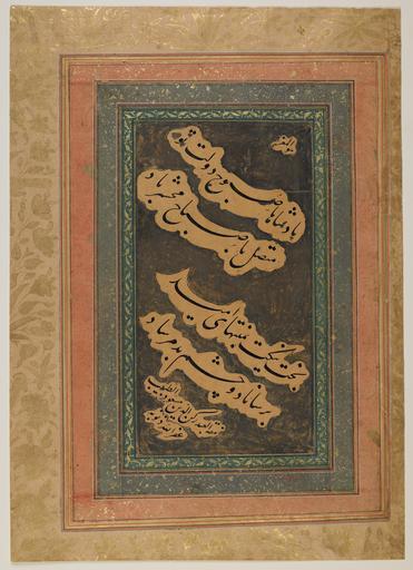 | Keywords: Quatrain Eulogizing a King WDL6990.png  Artwork ru Аль-Табиб Рукн аль-Дин  асуд fr al-Tabib Rukn al-Din Mas'ud en al-Tabib Rukn al-Din Mas'ud zh 鲁 ·丁·麦斯伍德·塔比伯 pt al-Tabib Rukn al-Din Mas'ud ar الطبيب، رُكن الدين مسعود es al-Tabib Rukn al-Din Mas'ud ru Четве остишие восхваляющее п авителя fr Quatrain faisant l'éloge d'un roi en Quatrain Eulogizing a King zh 颂扬 位国王的四行诗 pt Quadra laudativa a um rei ar رُبَاعِيَّة في مدح مَلِك ru В этом каллиг афическом ф агменте соде жится <em> убаи</em> четве остишие выполненное пятистопным ямбом в честь п авителя Стихи написаны по диагонали че ными че нилами письмом насталик окаймлены полосами из облаков и наклеены на г убо ок ашенную основу лилового цвета Они гласят О П авитель Да будут ут а твоей судьбы/Длиться до ут а дня Сбо а/Пусть удача доведет тебя до к айних п еделов надежды/И да минует тебя завистливое око В таких вы ажениях поэт желает п авителю удачи до скончания в емен буквально вплоть до <em>mahshar</em> дня Сбо а на Ст ашный Суд и вечной защиты от зависти или <em>chasm-i bad</em> завистливого ока В нижнем левом углу каллиг аф Рукн аль-Дин  асуд аль-Табиб сообщает что пе еписал <em>namaqahu</em> текст и п осит Бога п остить его за несове шенства Рукн аль-Дин имел п озвище аль-Табиб докто поскольку он п оисходил из д евнего  ода в ачей п авителей и сам занимал высокий пост п и диване или дво е шаха Аббаса I годы п авления 1587 1629 гг в Исфахане Когда пе сидский п авитель не вылечился от болезни он заставил Рукн аль-Дина ве нуть жалованье и вынудил его покинуть го од Рукн аль-Дин отп авился в  ашхад севе о-восточный И ан а оттуда в Балх сов еменный Афганистан и далее в Индию Он п иоб ел известность как масте стиля письма насталик Возможно Рукн аль-Дин создал это хвалебное четве остишие для шаха Аббаса I до своего изгнания <br>Каллиг афия пе сидская; Иллюмини ование  укописей; Исламские  укописи; Ко оли и п авители; Письмо насталик; Пе сидская поэзия; Поэзия fr Ce fragment de calligraphie est composé d'un <em>ruba'i</em> quatrain en pentamètre iambique honorant un roi Écrits en oblique avec des caractères nasta'liq noirs les vers apparaissent dans des rubans de nuage sur un fond violet peint assez sommairement et indiquent  « Oh roi puissent les matins de ta fortune / Durer jusqu'au matin du jour du rassemblement / Puissent la chance te mener aux limites extrêmes de l'espoir / Et le mauvais œil ne jamais t'atteindre » Avec ces paroles le poète souhaite au roi la bonne fortune jusqu'à la fin des temps littéralement jusqu'au <em>mahshar</em> jour du rassemblement lors du Jugement dernier et la protection éternelle contre l'envie ou <em>chasm-i bad</em> mauvais œil Dans l'angle inférieur gauche une note du calligraphe Rukn al-Din Mas'ud al-Tabib mentionne qu'il a copié le <em>namaqahu</em> texte et il demande à Dieu de pardonner ses défauts Rukn al-Din fut surnommé al-Tabib le docteur car il était issu d'une longue lignée de médecins du roi Il occupa d'ailleurs un haut poste à la cour ou divan du Chah 'Abbas I<sup>er</sup> règne  1587 1629 à Isfahan mais lorsque le souverain persan ne se remit pas d'une maladie il demanda que Rukn al-Din le remboursât puis il le chassa de la ville Rukn al-Din partit pour Mashhad dans le nord-est de l'Iran ville à partir de laquelle il voyagea jusqu'à Balkh aujourd'hui en Afghanistan et finalement en Inde Maître reconnu de l'écriture nasta'liq il a probablement réalisé ce quatrain élogieux pour le Chah 'Abbas I<sup>er</sup> avant que ce dernier le bannisse <br>Calligraphie persane; Enluminures; Manuscrits islamiques; Rois et dirigeants; Écriture nastaliq; Poésie persane; Poésie en This calligraphic fragment includes a <em>ruba'i</em> iambic pentameter quatrain in honor of a king Written diagonally in black Nasta'liq script and framed by cloud bands on a rather crudely painted purple background the verses read Oh King may the mornings of your fortune / Last until the morning of the Day of Gathering / May good luck take you to the utmost limit of hope / And may the evil eye not reach you With these words the poet wishes the king good fortune until the end of time literally until <em>mahshar</em> the Day of Gathering at the Last Judgment and eternal protection against envy or <em>chasm-i bad</em> the evil eye In the lower left corner the calligrapher Rukn al-Din Mas'ud al-Tabib states that he has copied the <em>namaqahu</em> text and asks God to forgive his shortcomings Rukn al-Din was nicknamed al-Tabib the doctor as he came from a long line of royal physicians and he himself held high position at the divan or court of Shah 'Abbās I reigned 1587 1629 in Isfahan However when the Persian ruler did n