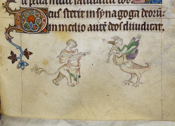 | Keywords: Queen Mary Psalter grotesques playing citole and horn.jpg en British Museum image Royal 2 B VII f 192 Detail of a bas-de-page scene of two grotesques one playing a citole and one playing a horned instrument with an inhabited initial 'D' eus with a lion at its centre 1320-01-01 http //www bl uk/catalogues/illuminatedmanuscripts/record asp MSID 6467 CollID 16 NStart 20207 the Queen Mary Master other versions http //www bl uk/catalogues/illuminatedmanuscripts/ILLUMIN ASP Size mid IllID 53145 From Queen Mary psalter Wikipedia article The psalter was perhaps produced c 1310 “1320 by one main scribe and unusually for a work so heavily illuminated a single artist 4 who is now known as the Queen Mary Master It was probably made in London and possibly for Isabella of France queen of Edward II of England 5 though there is no agreement on the matter 4 For the next two hundred years its history is not known A note in a sixteenth-century hand indicates that it was owned by an Earl of Rutland and though it does not identify the earl it appears likely that it was Henry Manners A Protestant he was imprisoned in May 1553 which may explain how the psalter landed in the possession of Queen Mary a second note in Latin explains that the psalter was impounded by Baldwin Smith a customs officer and thus remained in England 6 It remained in the possession of Queen Mary and her successors until 1757 when George II donated the Old Royal Library to the British Museum 3 PD-old-70-1923 Queen Mary Psalter 1310-1320 - BL Royal MS 2 B VII Citole Medieval miniatures of musicians String instruments in art String instruments Lute family instruments Guitar family instruments Horn Trumpet family instruments Mythological creatures |