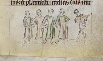 | Keywords: Queen Mary Psalter musician with citole and youths.jpg en British Library image Royal 2 B VII f 189 Detail of a bas-de-page scene of four youths in a row their hands connected by ribbons and a musician playing a citole 1320-01-01 http //www bl uk/catalogues/illuminatedmanuscripts/record asp MSID 6467 CollID 16 NStart 20207 the Queen Mary Master other versions http //www bl uk/catalogues/illuminatedmanuscripts/ILLUMIN ASP Size mid IllID 53138 From Queen Mary psalter Wikipedia article The psalter was perhaps produced c 1310 “1320 by one main scribe and unusually for a work so heavily illuminated a single artist 4 who is now known as the Queen Mary Master It was probably made in London and possibly for Isabella of France queen of Edward II of England 5 though there is no agreement on the matter 4 For the next two hundred years its history is not known A note in a sixteenth-century hand indicates that it was owned by an Earl of Rutland and though it does not identify the earl it appears likely that it was Henry Manners A Protestant he was imprisoned in May 1553 which may explain how the psalter landed in the possession of Queen Mary a second note in Latin explains that the psalter was impounded by Baldwin Smith a customs officer and thus remained in England 6 It remained in the possession of Queen Mary and her successors until 1757 when George II donated the Old Royal Library to the British Museum 3 PD-old-70-1923 Queen Mary Psalter 1310-1320 - BL Royal MS 2 B VII Citole Medieval miniatures of musicians String instruments in art String instruments Lute family instruments Guitar family instruments |