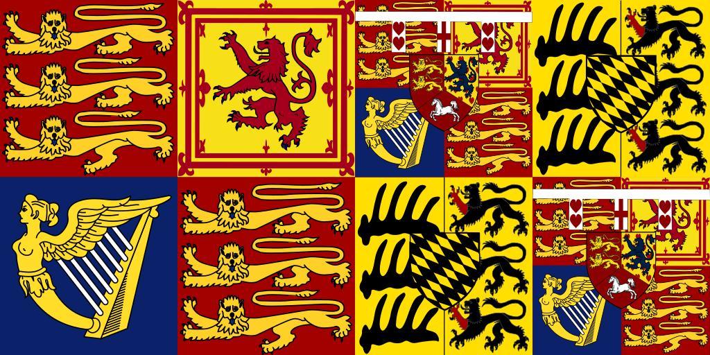 | Keywords: Queen Mary of Teck Standard.svg Inkscape Royal Standard of Mary of Teck Queen Consort of George V of the United Kingdom and the British Dominions 1910-1936 and British Queen Dowager 1936-1953 Blazon Quarterly I and IV Gules three lions passant guardant in pale Or for England ; II Or a lion rampant within a double tressure flory-counter-flory Gules for Scotland ; III Azure a harp Or stringed Argent for Ireland All impaling quarterly I and IV grand-quarterly i and iv Gules three lions passant guardant in pale Or for England ; ii Or a lion rampant within a double tressure flory-counter-flory Gules for Scotland ; iii Azure a harp Or stringed Argent for Ireland ; overall an escutcheon tierced per pale and per chevron for Hanover i Gules two lions passant guardant Or for Brunswick ii Or a semy of hearts Gules a lion rampant Azure for Lunenburg iii Gules a horse courant Argent for Westfalen all differenced with a label of three points argent two hearts a Latin cross two hearts all gules; II and III Or three half-branches of hart sable for Württemberg impaling Or three lions passant sable for Hohenstaufen overall an inescutcheon couped chapé-chaussé or and argent http //flagspot net/flags/gb_roge5 html mary Tincture Change of the Württemberg's escutcheon from 50px 50px SVG elements from 50px 50px 50px 50px 50px and 50px 2008-02-26 Jake the Editor Man Queen Mary of the United Kingdom 1 Royal Standards of Consorts of the United Kingdom Mary Royal Standards of deceased members of the royal family of the United Kingdom Mary Black blue red white yellow flags Flags with harps Flags with hearts Flags with horses Flags with lions facing left Flags with two crosses Flags with two crowns Heraldic banners Coats of arms of the house of Teck |