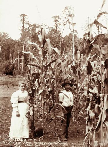 | Keywords: Queensland State Archives 2383 Couple and 13 feet high corn at Manitzkys Farm Teutoberg Blackall Range c 1899.png en Couple and 13 feet high corn at Manitzky's Farm Teutoberg Blackall Range Teutoberg was renamed as Witta in 1916 1899 http //www archivessearch qld gov au/Image/DigitalImageDetails aspx ImageId 2383 Preferred citation Queensland State Archives Digital Image ID 2383 ID label 1108936 http //www archivessearch qld gov au/Search/AgencyDetails aspx AgencyID 1993 Lands Department Survey of Lands Branch Photographic Branch en Copyright expired Information field Decade 1890-1899 Information field Place en Sunshine Coast Region Information field Keywords en Agriculture Information field Material Type en Photographic material Information field Type en Image PD-Australia QSA media uploaded by User 99of9 Photographic material from the Queensland State Archives Queensland in the 1890s Farms in Queensland Blackall Range Witta Queensland Maize Farmers of Queensland |