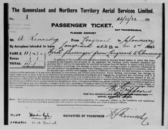 | Keywords: Queensland State Archives 2976 Qantas passenger ticket No 1 for a flight from Longreach to Cloncurry issued to A Kennedy and signed by Hudson Fysh 22 November 1922.png en Qantas passenger ticket No 1 for a flight from Longreach to Cloncurry issued to A Kennedy and signed by Hudson Fysh Ticket issued to Alexander Kennedy and signed by Hudson Fysh 1922-11-22 http //www archivessearch qld gov au/Image/DigitalImageDetails aspx ImageId 2976 Preferred citation Queensland State Archives Digital Image ID 2976 ID label 1140017 http //www archivessearch qld gov au/Search/AgencyDetails aspx AgencyID 2024 Premier and Chief Secretary's Department State Public Relations Bureau Photographic Unit en Copyright expired Information field Decade 1920-1929 Information field Place en Queensland Information field Material Type en Photographic material Information field Type en Image PD-Australia QSA media uploaded by User 99of9 Photographic material from the Queensland State Archives 1922 in Queensland Longreach Airport Air tickets Cloncurry Queensland Qantas |
