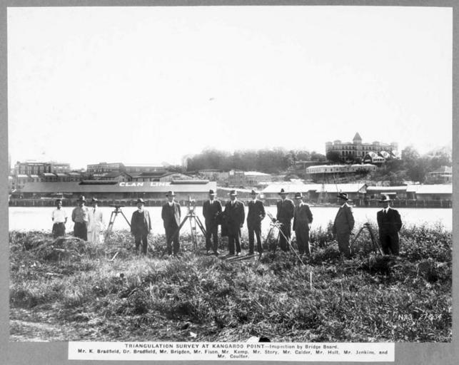 | Keywords: Queensland State Archives 3094 Bridge Board inspection of the triangulation survey at Kangaroo Point Brisbane 27 June 1934.png en Bridge Board inspection of the triangulation survey at Kangaroo Point Brisbane Story Bridge construction - photograph includes Mr K Bradfield Dr Bradfield Mr Brigden Mr Fison Mr Kemp Mr Story Mr Calder Mr Holt Mr Jenkins and Mr Coulter 1934-06-27 http //www archivessearch qld gov au/Image/DigitalImageDetails aspx ImageId 3094 Preferred citation Queensland State Archives Digital Image ID 3094 ID label 1171408 http //www archivessearch qld gov au/Search/AgencyDetails aspx AgencyID 1995 Lands Department Survey Office Cartographic Branch Photographic Section en Copyright expired Information field Decade 1930-1939 Information field Place en Brisbane City Information field Keywords en Bridges Information field Material Type en Photographic material Information field Type en Image PD-Australia QSA media uploaded by User 99of9 Photographic material from the Queensland State Archives 1934 in Brisbane Kangaroo Point Queensland Story Bridge construction Surveying equipment All Hallows' School Brisbane John Bradfield Wharves and quays in Queensland John Douglas Story |